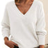 Enfärgad stickad tröja med v-ringning - Moderiktiga lösa långärmade toppar för höst- och vinterkläder för kvinnor